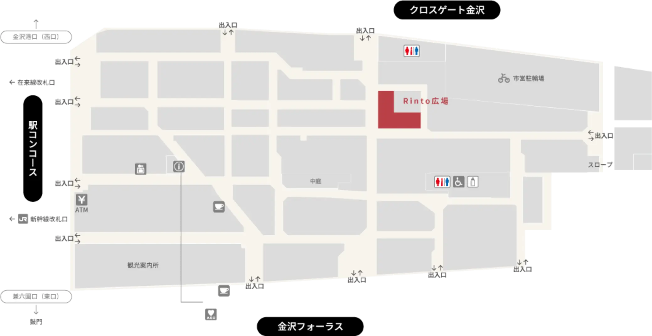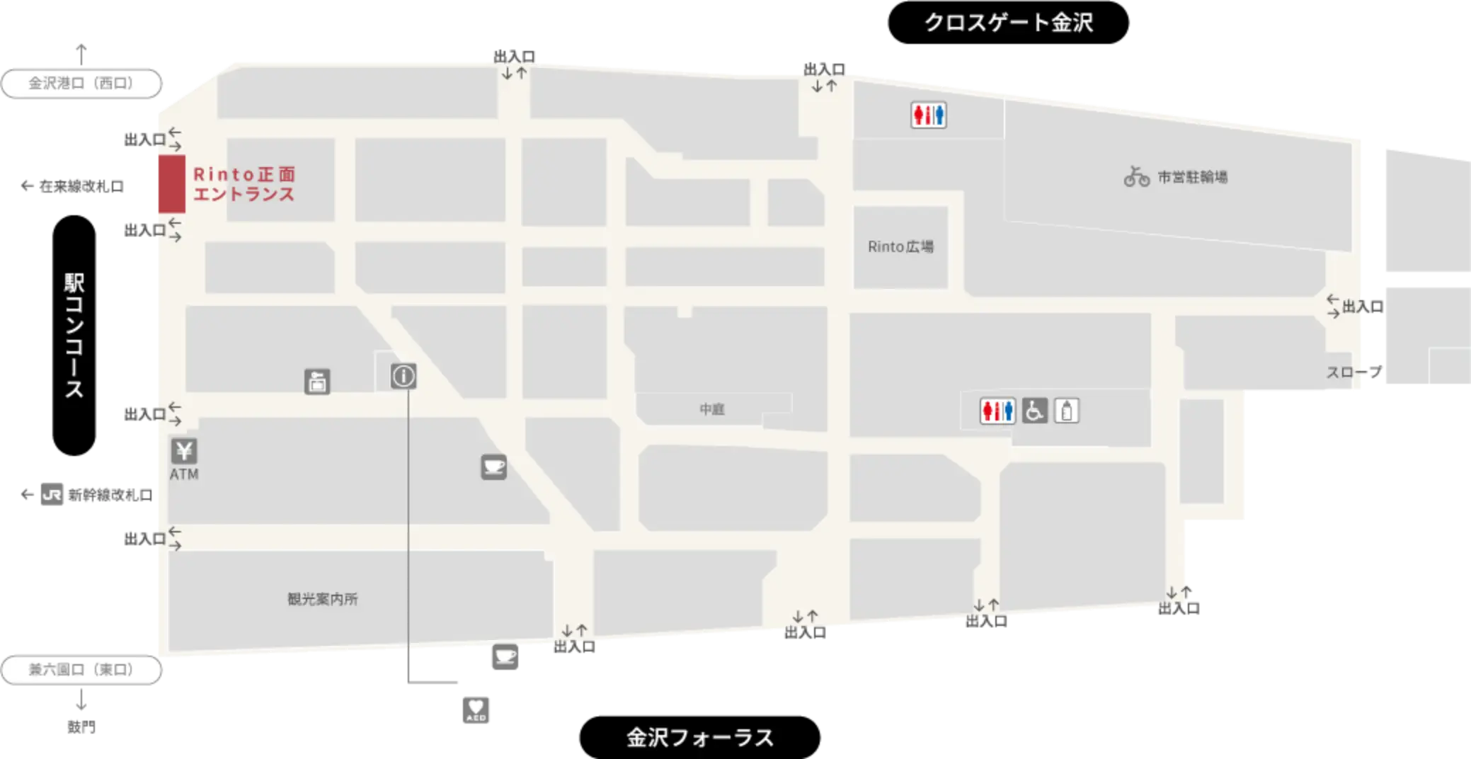 隣接する金沢フォーラス、クロスゲート金沢の連絡通路に面し、人通りの多い区画となっております。