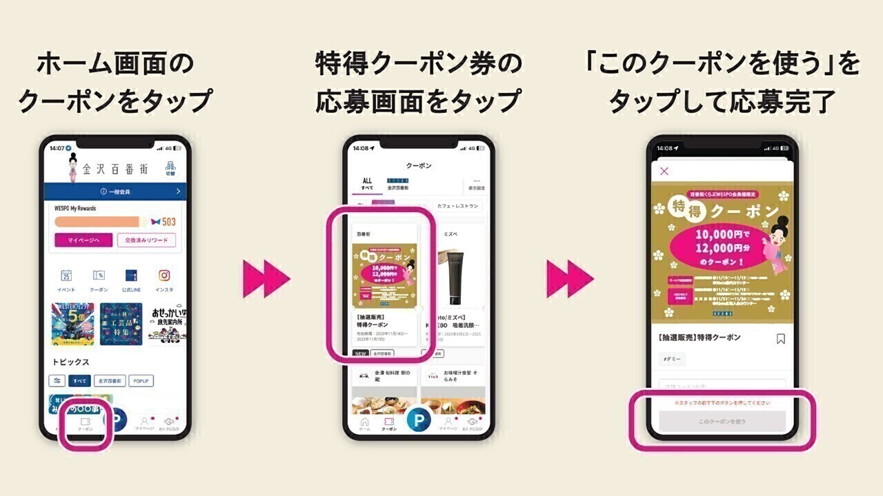 金沢百番街限定のプレミアム付きクーポンで、10,000円で12,000円分のクーポンとなります。