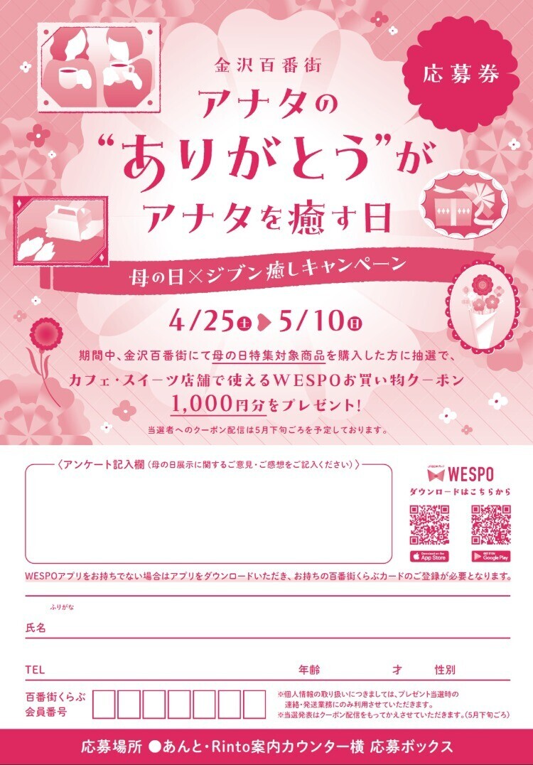 期間中、金沢百番街にて母の日特集対象商品を購入した方に抽選で、