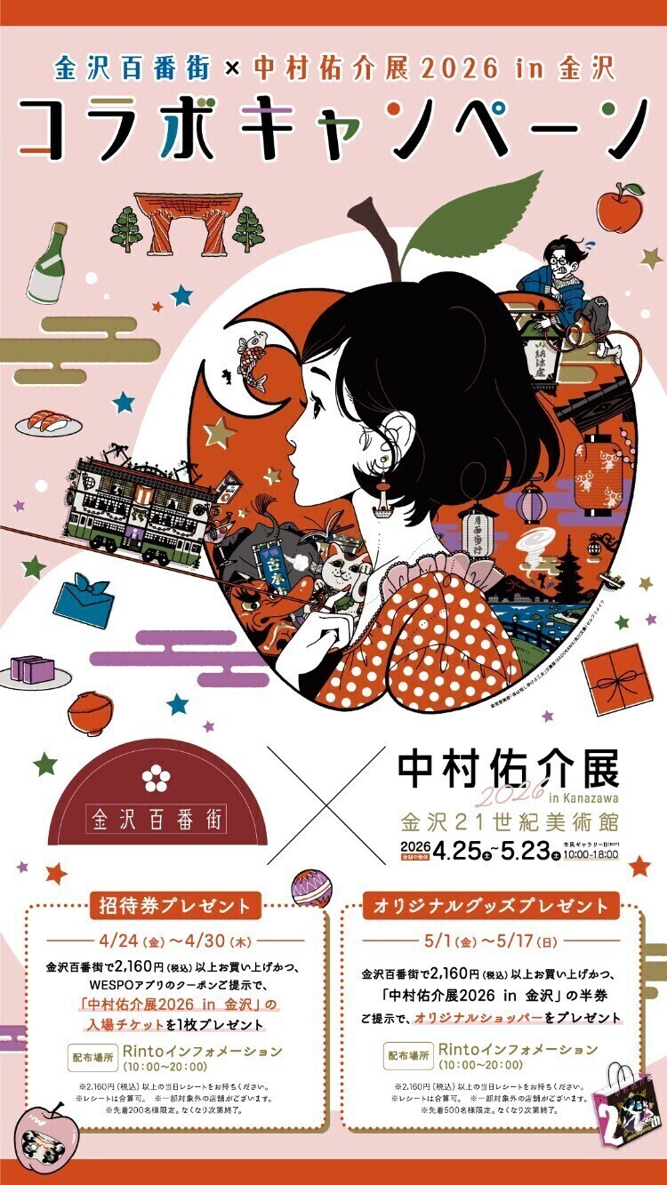 期間中に金沢百番街にて、2,160円(税込)以上お買い上げのうえ、WESPOアプリのクーポンをご提示いただいた方に、「中村佑介展2026 in 金沢」の入場チケットを1枚プレゼントいたします!