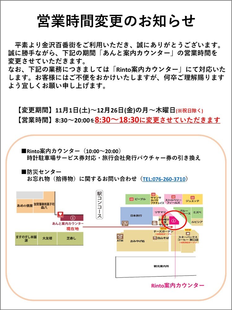 平素より金沢百番街をご利用いただき、誠にありがとうございます。