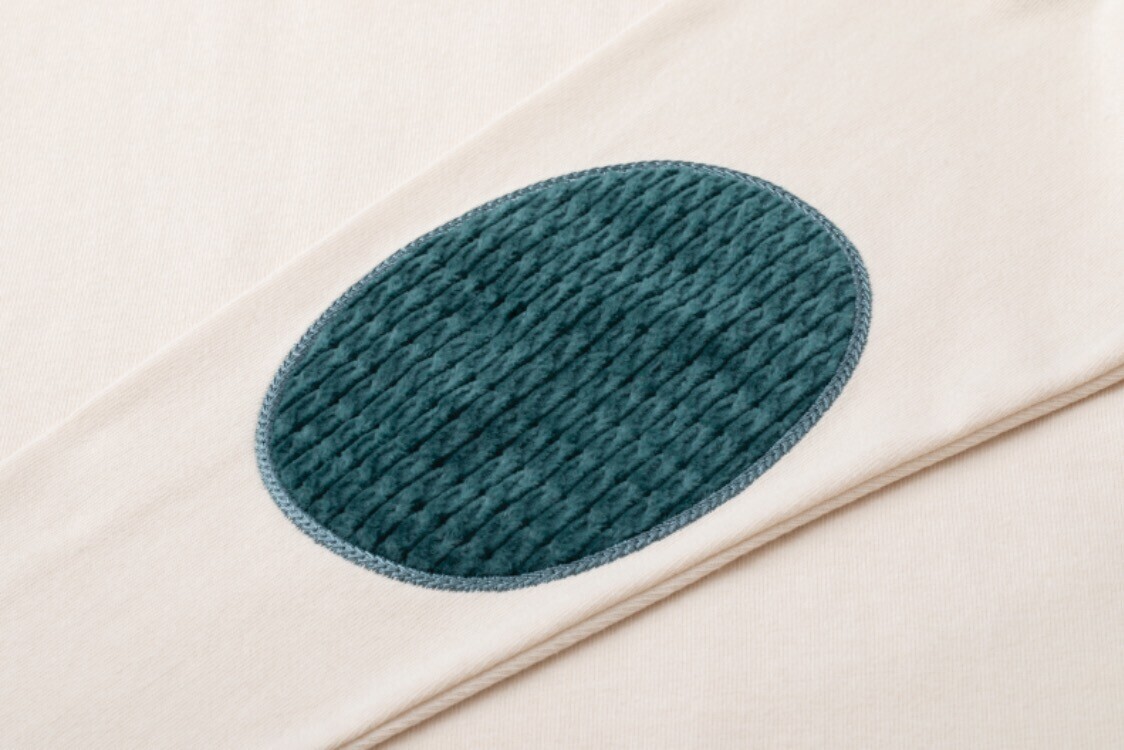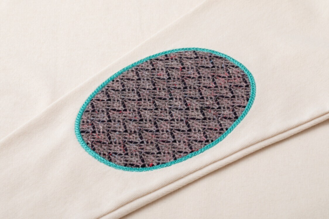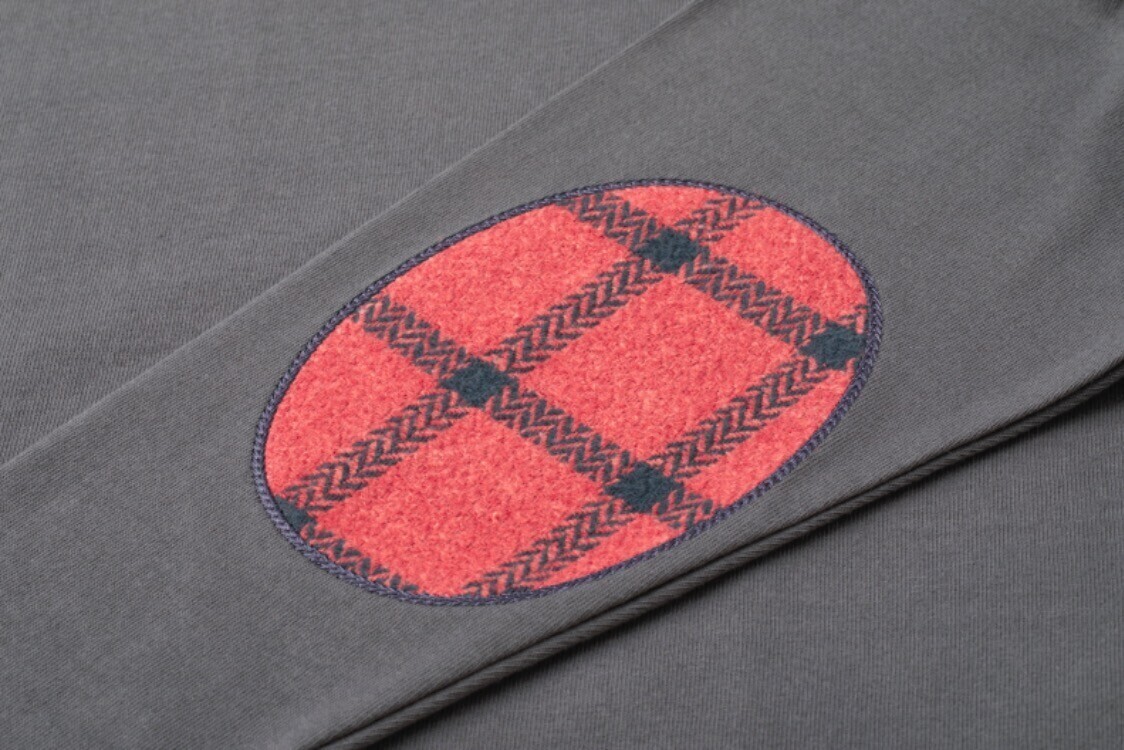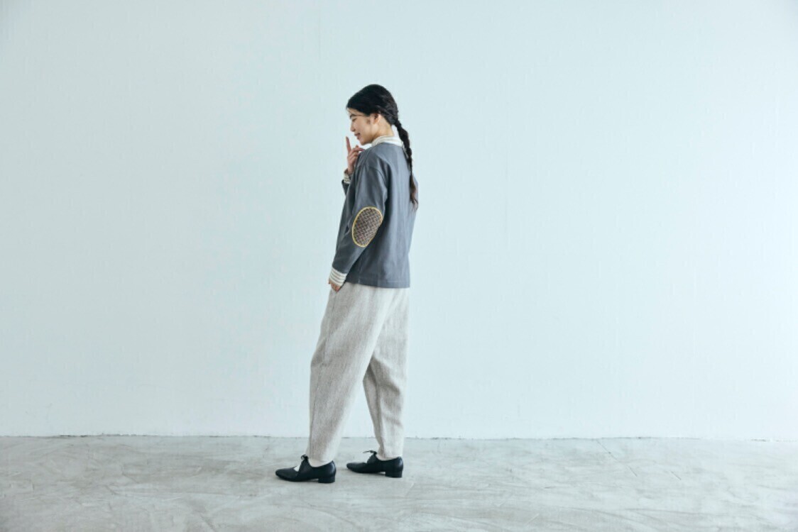 新潟県見附市で生地や糸の企画・販売を行う「浅記」のデットストック生地を使用しました。紡績工程で出る短繊維の落ちワタをポリエステル糸と紡いでリサイクル糸にし、織り上げられた生地です。繊維が不均一でこぶや太さにムラがあるため、どこか懐かしい、あたたかみのある表情に織り上がります。