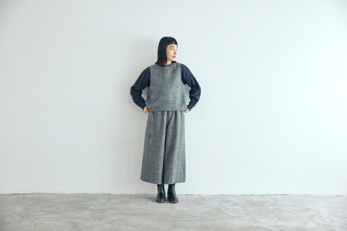 ゆったりとはけて、ロングスカートのようにも見えるワイドパンツ。ウエストゴムで楽な着用感ながら、ツイードの生地感で上品に着ていただけます。同シリーズのベストと合わせて、セットアップで着こなしていただくのもおすすめです。