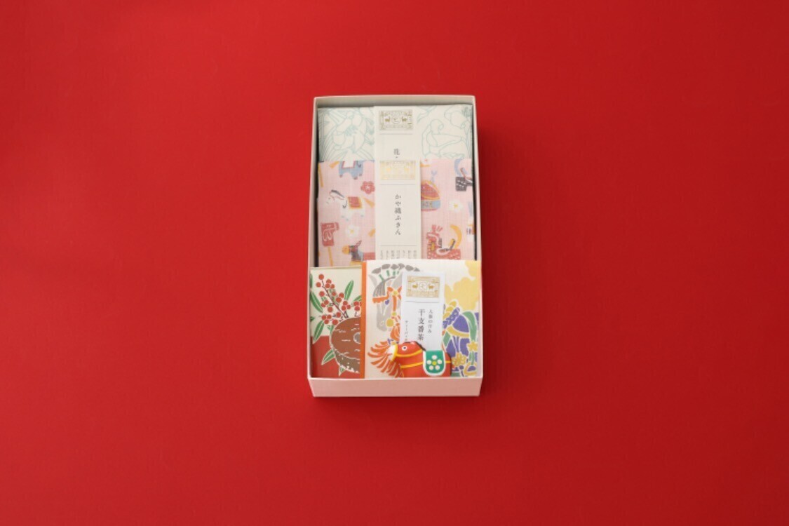 全国各地の郷土玩具から着想した干支のモチーフと、縁起物である松竹梅を散りばめたかや織ふきんです。