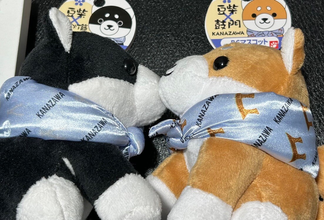 赤柴には鼓門がそれぞれプリントされた布を首周りに巻いています