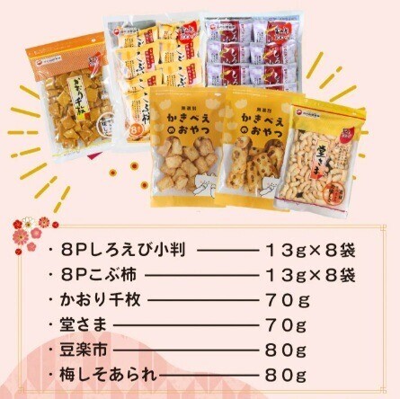 ■内容量・8Pしろえび小判…13g×8袋・8Pこぶ柿…13g×8袋・かおり千枚…70g・堂さま…70g・豆楽市…80g・梅しそあられ…80g