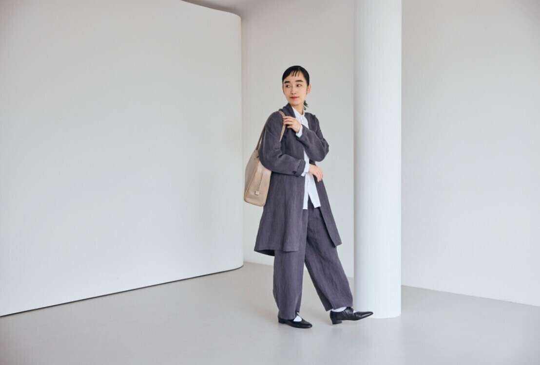 ゆったりしたサイズ感のワイドパンツは、麻のハリ感により立体感のあるシルエット。トップスはコンパクトなものならオーバーで、ゆったりしたブラウスやカットソーならタックインしてもきれいにまとまります。