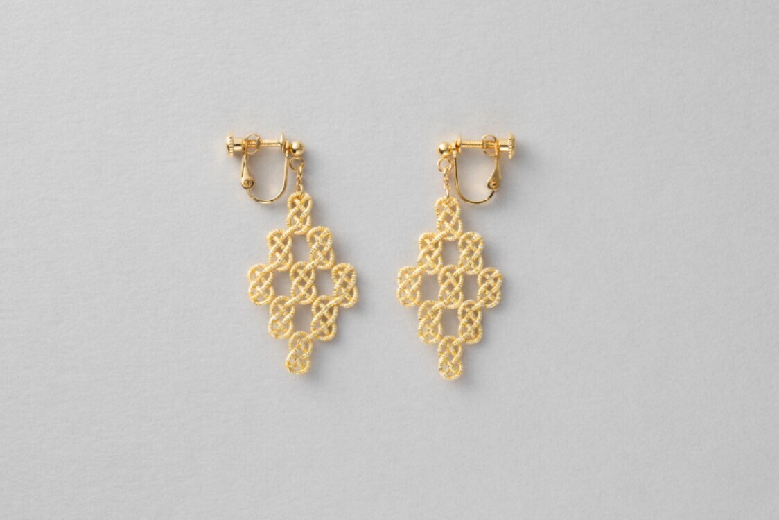 ダイヤの形状全体が、緩やかにねじれるような仕上げに制作された水引細工のイヤリングです。水引の基本の結びである「あわじ結び」を組み合わせてダイヤモンド形状に仕上げています。