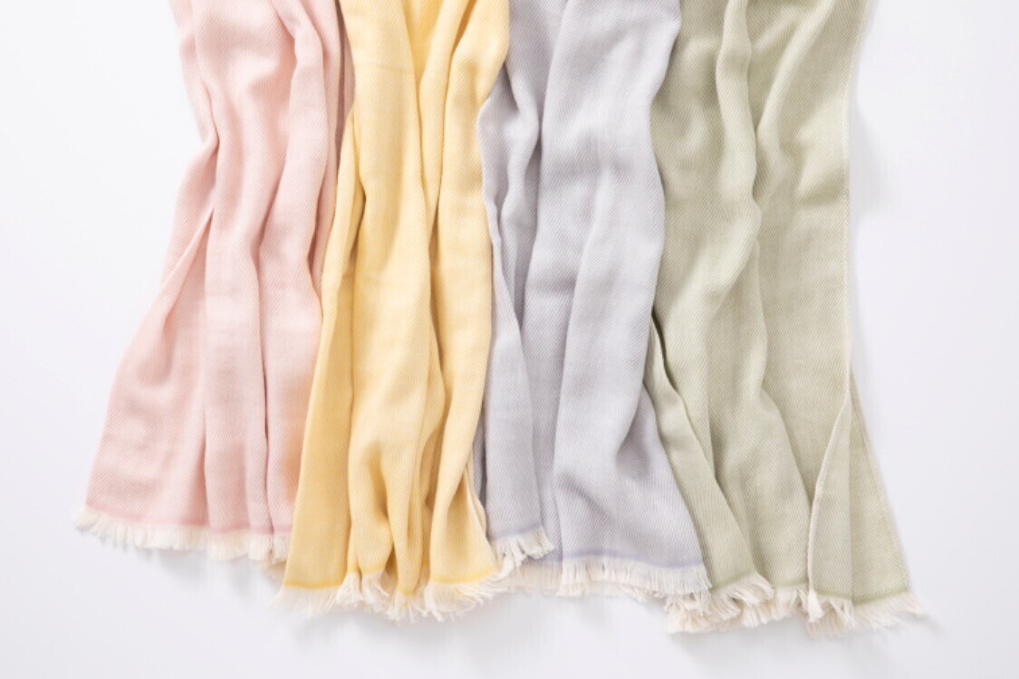 タオルの産地・今治で作った、綿100%のスカーフ。やわらかでふっくらとした肌触りで、奥行きのある綾織りの表情が着こなしのさりげないポイントになります。甘撚り糸を用いて追及したやわらかな質感が肌に心地よく、空気を含んであたたかいため季節の変わり目におすすめです。経糸に生成の糸、緯糸に色糸を使い、綾織りの技法で織り上げることで、無地のようでありながら表情のある生地に仕上げました。ご家庭で洗濯していただけるのでお手入れも簡単です。