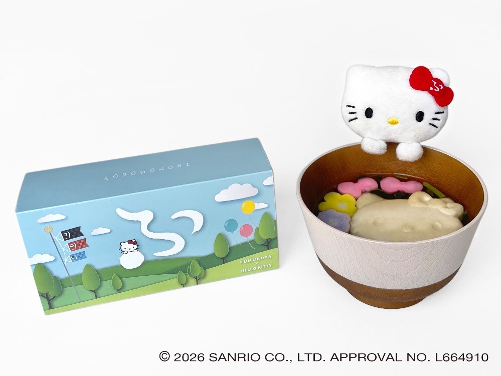 ハローキティが不室屋と出会い、お湯を注ぐだけでお吸いものに早変わりする「宝の麩」になりました。